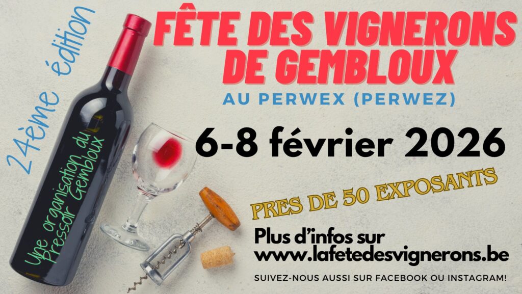 Vous étiez un peu plus de 1300 personnes à nous rendre visite début 2025 et nous nous réjouissons de vous retrouver à Perwez en février 2026 pour la 24ème édition de la Fête des Vignerons.